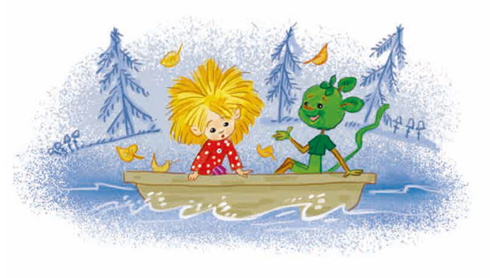 Приснилось Кузьке, будто они с Афонькой и Адонькой играют, и вдруг Сюр с Вуколочкой тащат блин. Проснулся – так и есть: блинами пахнет. Стол от угощения ломится. Тут дверь приоткрылась, в горницу, как зелёный лист, влетел Лешик. Кузька кубарем с кровати, как со снежной горы, съехал. Друзья выбежали из дому, побегали, попрыгали по мосту. Колокольчики весело звенели.