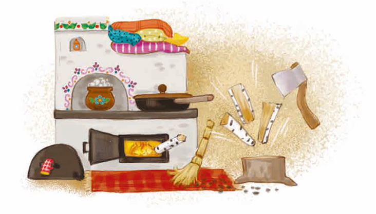 Чугуны в печи булькают. Сковороды шипят. Огонь трещит. Возле печи топор прыгает, рубит дрова. Поленья – раз-раз! – одно за другим скачут в печь.