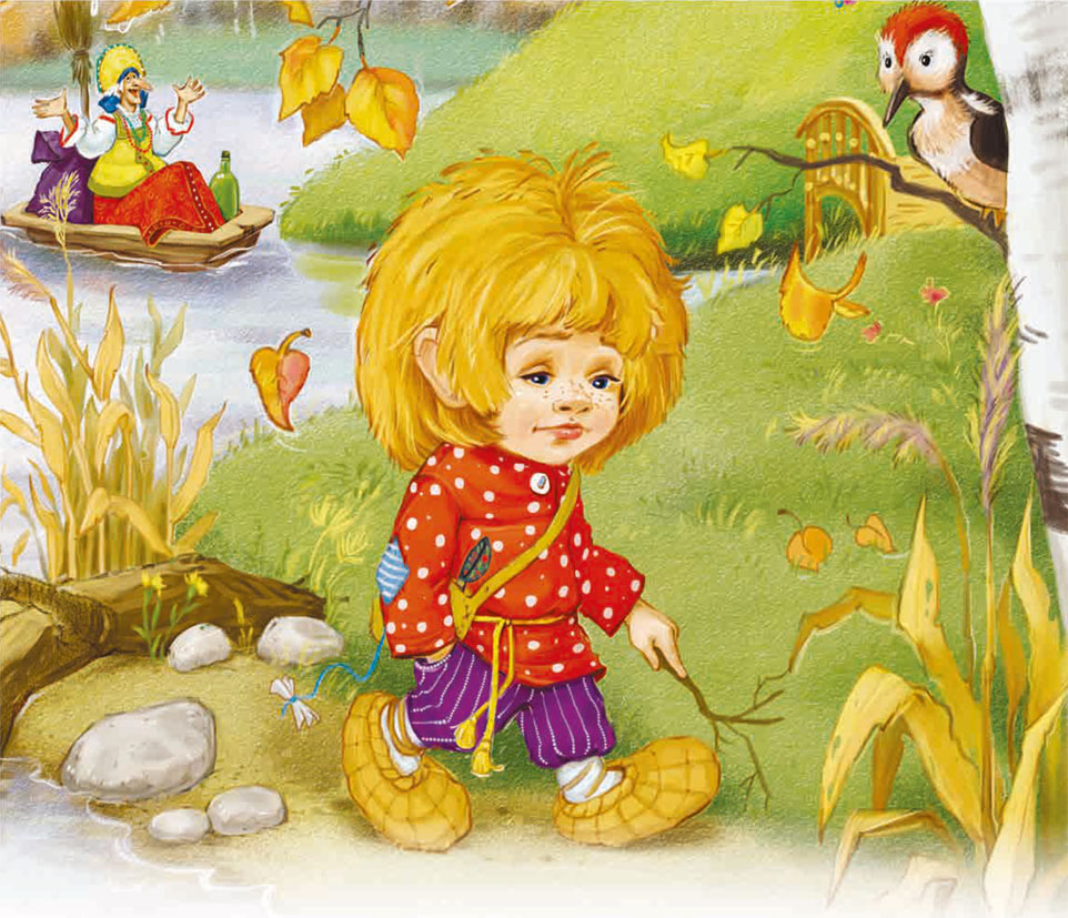 Кузька спрятался в траву. Что, если настроение у Яги не успеет исправиться? Но чем ближе песня, тем веселее. А когда из-за поворота, из лесной чащобы по речной излучине вылетело корыто, песня уже была хоть куда. Прибрежное эхо подхватило её. Развесёлые «эх!» да «ух!» заухали, загудели над круглой поляной. Корыто причалило у моста. Серебряные колокольцы звякнули, золочёные доски брякнули. Баба-яга прыгнула на берег. Дятел уже сидел на золочёных перилах.