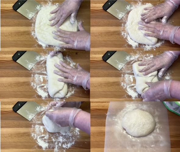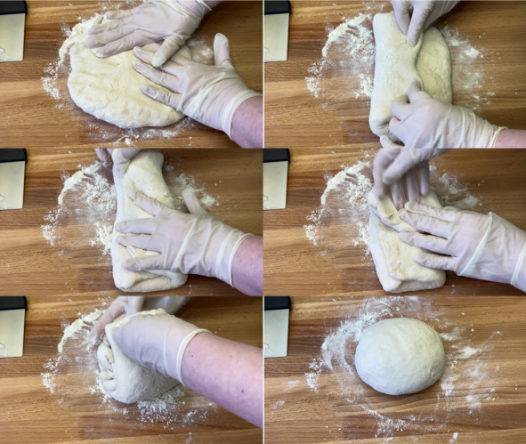 3. Рабочую поверхность присыпаем мукой и выкладываем на неё тесто. Собирая края теста к середине, тесто округляем, затем разминаем в лепёшку. 1/3 часть теста с одного края складываем к середине, 1/3 часть теста с противоположного края складываем на предыдущую часть теста внахлёст, повторяем всё то же самое только с двух других противоположных краёв теста. Прижимая тесто к рабочей поверхности швом вниз, вращательными движениями придаём тесту форму шара.