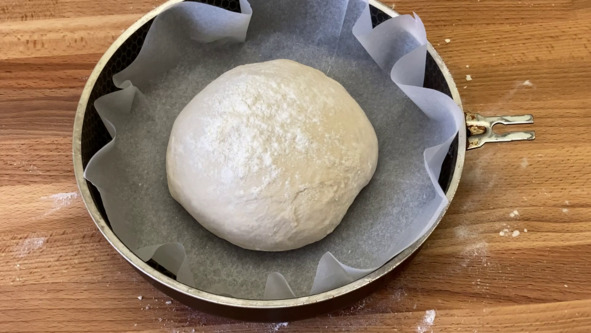 2. Выкладываем тесто на рабочую поверхность присыпанную мукой и с помощью скребка собираем края теста к центру. Тесто округляем, присыпаем его мукой, а затем растягиваем в лепёшку. 1/3 часть теста с одного края сворачиваем к середине, 1/3 часть теста с противоположного края складываем на предыдущую часть теста внахлёст, повторяем всё то же самое только с двух других противоположных краёв теста. Прижимая тесто к рабочей поверхности швом вниз, вращательными движениями придаём тесту форму шара, выкладываем шар на пергамент и хорошо присыпаем мукой. Накрываем заготовку хлеба и оставляем минут на 30.