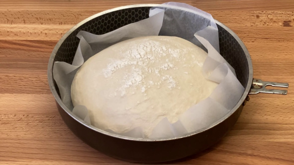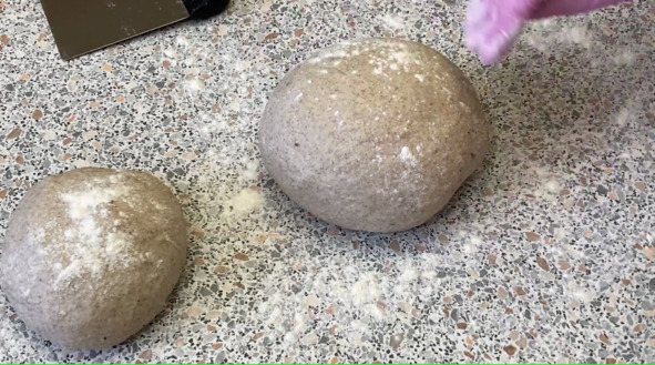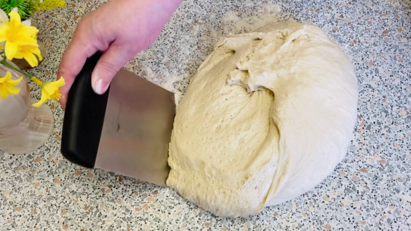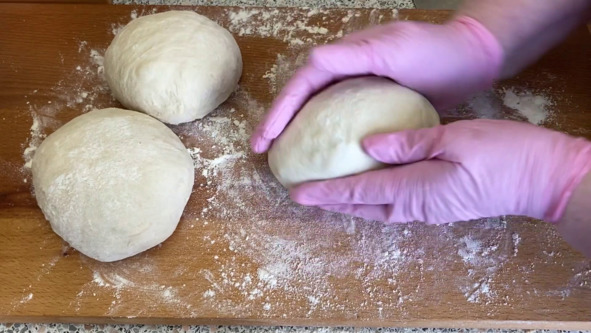 3. Выкладываем тесто на рабочую поверхность хорошо присыпанную мукой. Так как тесто несколько мягче и более липкое, чем обычное тесто, при помощи скребка собираем края теста к середине и округляем его. Делим тесто на 3 равные части и каждую часть округляем.