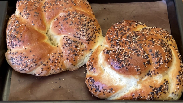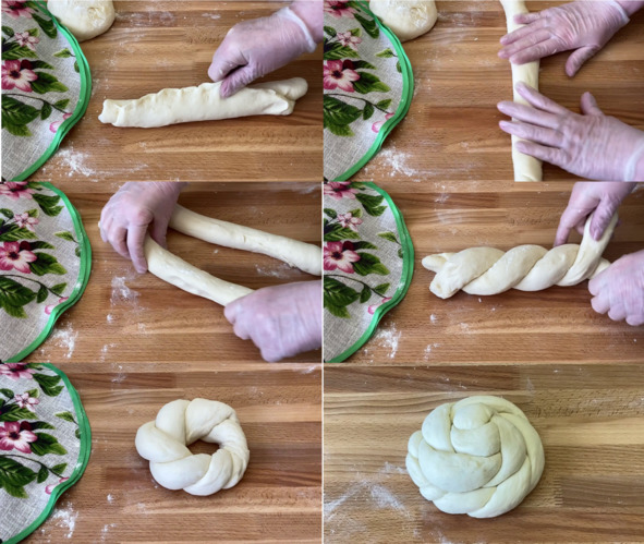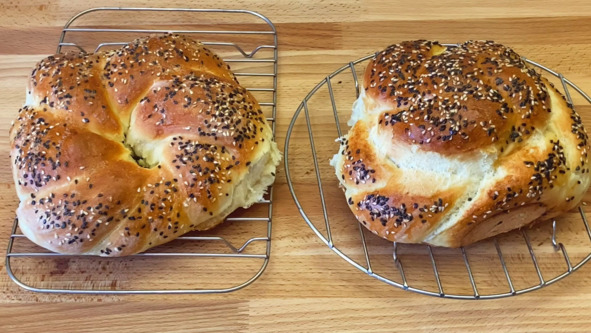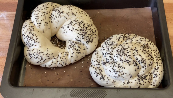 4. Формуем заготовки хлеба. Раскатываем один шарик теста в тонкий пласт, смазываем масляной суспензией, посыпаем тесто кунжутом и скатываем в рулет. Хорошо закрепляем шов. Рулет раскатываем так, чтобы он увеличился в длину раза в два. Откладываем в сторону и всё то же самое проделываем со вторым шариком теста. Получилось два жгута одинаковой длины, далее эти два жгута перекручиваем между собой, а затем скрепляем два конца и получаем форму калача. Таким же способом формуем вторую заготовку, но перекрученные жгуты сворачиваем в «улитку».