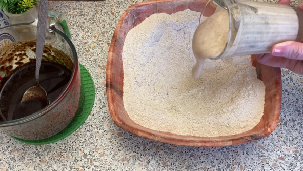 4. В мучную смесь выкладываем опару, остывший заваренный солод, добавляем воду.