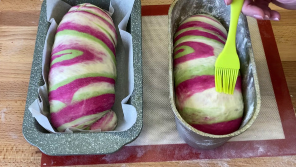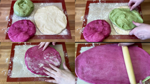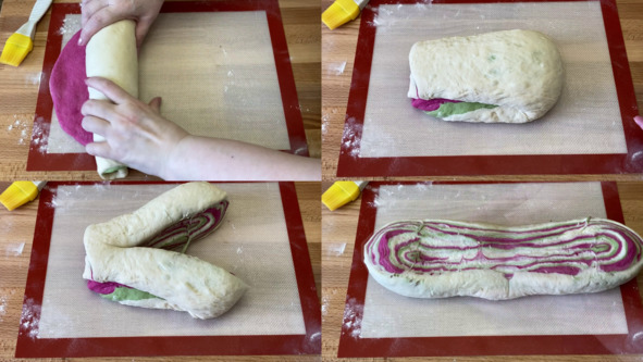 4. Выкладываем тесто на рабочую поверхность, которую предварительно присыпаем мукой. Сначала разминаем в небольшую лепёшку белое тесто, затем на белое тесто выкладываем лепёшку другого цвета, подгоняем её по размеру по отношению к белому тесту, поверх выкладываем последнюю лепёшку и также подгоняем её по размеру. Раскатываем трёхслойное тесто, придавая ему овальную форму, а затем сворачиваем тесто рулетом. Выкладываем рулет швом вниз, складываем пополам и делаем надрез, не доходя до края примерно полтора-два сантиметра. Тесто разворачиваем разрезом вверх, немного присыпаем мукой, раскатываем до тех пор, пока ширина пласта не увеличится примерно раза в два. Разрезаем пласт теста пополам и каждую половинку сворачиваем в рулет. Получаем 2 заготовки хлеба.