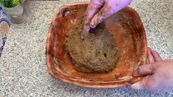 5. Замешиваем тесто, сначала можно с помощью лопатки, когда мука практически впитает в себя всю жидкость, переходим к замесу теста вручную. Тесто получается очень мягким и сильно липнет к рукам. Это нормально.