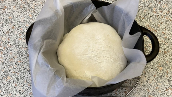 3. Хорошо разогреваем жаропрочную форму с крышкой, можно использовать для этого небольшую чугунную кастрюлю объёмом примерно 2,5 литра. Вместе с пергаментом выкладываем заготовку хлеба в горячую форму, при желании делаем на заготовке надрезы, форму накрываем крышкой и отправляем в хорошо разогретую духовку. Выпекаем 30 минут при температуре 240°С под крышкой и еще 20 минут при температуре 220ºC без крышки.