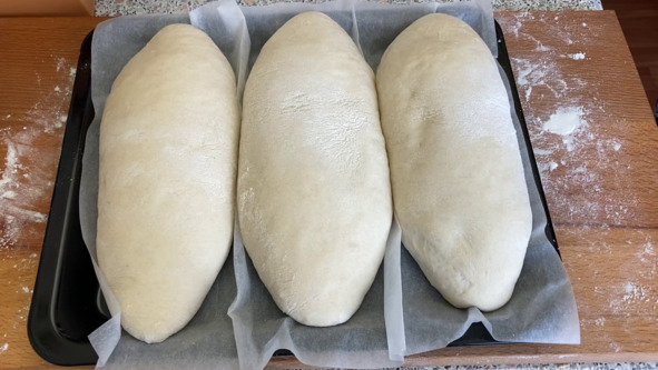4. Придаём каждой части теста форму булки продолговатого вида с заостренными кончиками. Получаем заготовки хлеба.
