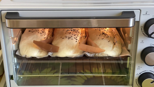 5. Выкладываем заготовки на противень застеленный пергаментом, смазываем масляной суспензией и щедро посыпаем кунжутом. Заготовки накрываем и оставляем на расстойке минут на 45.