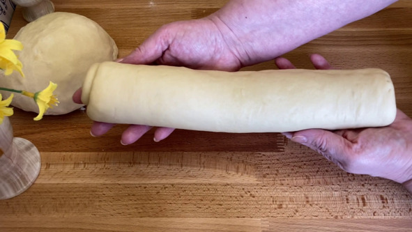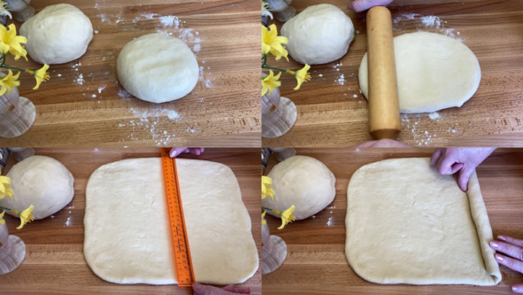 2. Рабочую поверхность немного присыпаем мукой и выкладываем на неё тесто. Делим тесто пополам, затем берём одну половинку, округляем её и раскатываем в прямоугольник размером примерно 25 на 30 сантиметров. Скатываем тесто в рулет, каждый виток теста хорошо закрепляем.