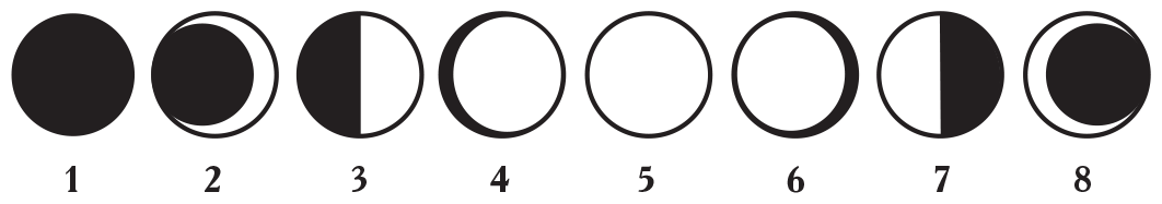 1 – Новолуние, 2 – серповидная Луна, 3 – первая четверть Луны, 4 – выпуклая Луна, 5 – Полнолуние, 6 – рассеивающая Луна, 7 – последняя четверть Луны, 8 – бальзамическая Луна.