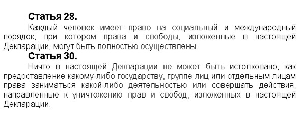 Каждый человек имеет право на социальный и международный порядок, при котором права и свободы, изложенные в настоящей Декларации, могут быть полностью осуществлены.