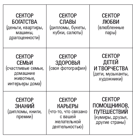 Итак, возьмите ватман, лучше красного цвета для усиления энергии, разделите его на девять квадратов. Далее напишите название секторов: богатство, слава, любовь, семья, здоровье, творчество и дети, знания, карьера, путешествия (рис. 1).