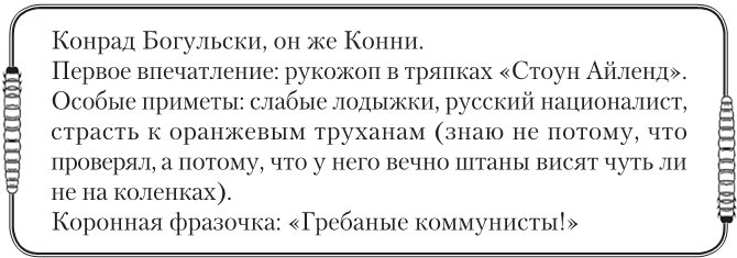 Я стал бояться неожиданных вопросов или что не справлюсь с заданием и снова выставлю себя на смех. Было проще заливать в себя шоты. Что я и делал, пока мне не сказали, что я исчерпал свой лимит. И вот я уже целуюсь с Эмилией. Вернее, Эмиль засосала в себя мои губы и сунула между ними язык. Потом почему-то мне выпало целоваться с Конни, хотя он вообще не участвовал, а колол лед прямо на полированной столешнице. В зубах у него сигарета, в руке – мой молоток с буквой «Н» на рукоятке. Наверное, в глазах у Богульски немного двоилось, потому что иногда он промахивался мимо непонятно откуда взявшейся огромной глыбы льда, и по полировке расходились радужные круги трещин.