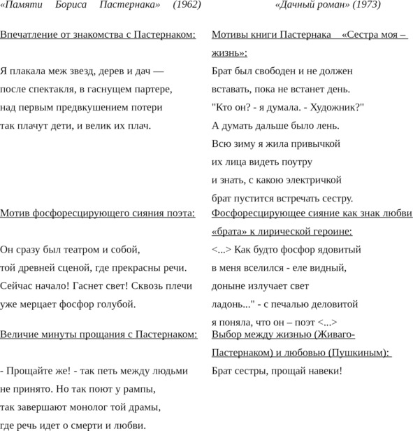 Ахмадулина не делает подобного новаторского шага, но сопоставление стихотворений позволяет увидеть в первом «спокойную торжественность» состоявшейся «предвечной» встречи с Пастернаком, а во втором – «взволнованную нежность» первого знакомства с его неповторимой поэзией. Это можно увидеть в следующей таблице.