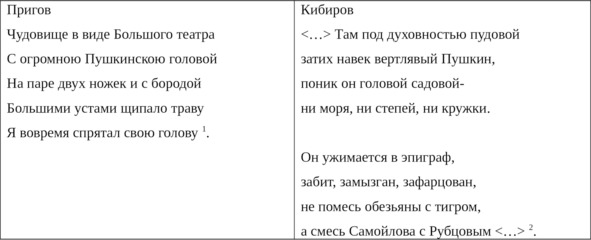 Тимур Кибиров в процитированном выше стихотворении «Сереже Гандлевскому. О некоторых аспектах нынешней социокультурной ситуации» использует основной прием концептуализма – виртуозную игру чужими языками, но разъятие, деконструкция этих языков порождает собственный язык лирического героя, отличающийся от персонажного языка-маски «Дмитрия Александровича Пригова». Составляющие этого языка – обрывки чужих фраз: «вертлявый Пушкин» Синявского; «море, степи, кружка» – лаконичный перечень пушкинских образов из школьной программы; лицейское прозвище «помесь обезьяны с тигром». При этом не заглушен и собственный голос автора: «голова садовая» – иронически-дружеское обращение к «живому» Пушкину, а также к его памятникам в различных «садах» и скверах России; « <…> смесь Самойлова с Рубцовым» – авторская негативная оценка пушкинистики, а заодно и представлений о современной поэзии, от рафинированно-интеллигентской до стилизованно-деревенской.