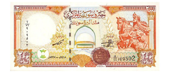Современные (2015 г.) сирийские двести фунтов. Ныне они стоят около 1,5 доллара. В правом углу купюры изображен Саладин, герой войн с европейскими рыцарскими формированиями.