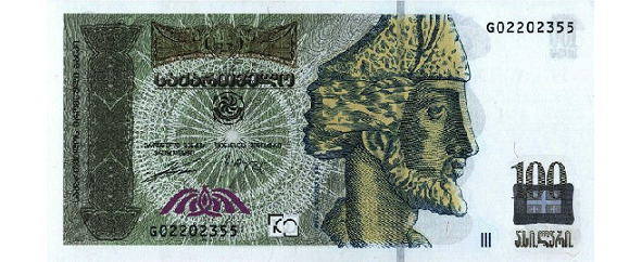 Сто грузинских лари (груз. «запас», «имущество») 2004 года. Очень оригинальный, неплохой дизайн. В данной купюре использовано стилизованное изображение поэта Шота Руставели. Курс к рублю на начало 2016 года – 1: 32. Средняя зарплата в стране 500 долларов (порядка 900 лари), однако, ее получают лишь около 35% трудоспособного населения – госслужащие, полицейские, и т. п.