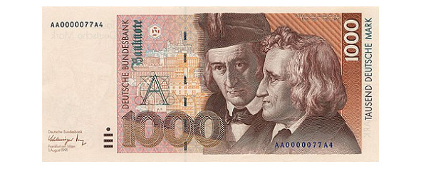 6. Марка ФРГ перед переходом на дензнаки Евросоюза. До того, благодаря низкой (3%) инфляции, считалась официальной, или не официальной валютой некоторых восточноевропейских стран. На данной купюре изображены ученые-филологи и сказочники, братья Гримм.