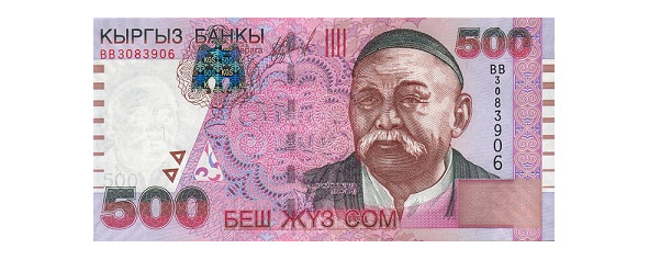 2. Валюта Киргизии, сом (KGS). Изображение поэта Саякбая Каралаева, профессионального исполнителя народного эпоса «Манас». Курс к рублю 1:0,85, доллар стоит 69 сом (ов). Средняя зарплата в Киргизии от 3 000 (сельский врач, учитель) до 16 000 сом в столице – Бишкеке. Можно сказать, «самое среднее» – 12 000 сом, 220 долларов, или 10 000 рублей.