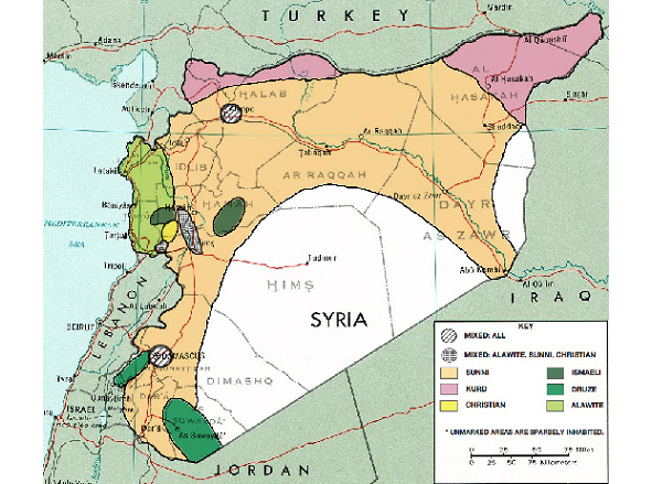 2. Как видно на карте 2003 года, этнический и религиозный состав страны неоднороден. Белый цвет – малозаселенные, но преимущественно суннитские области, оранжевый – сунниты (этнические арабы-сирийцы), розовый – курды (картвелы – остатки племен Великой Грузии, либо бывшие армяне, вопрос открытый). Желтый – христиане. Серо-зеленое – исмаилиты (одна из шиитских ветвей ислама), зеленый – друзы (обособленное племя, исповедующее «особый» ислам). Салатовый – алавиты, чтящие Али ибн Табу Алиба, двоюродного брата пророка Мухаммеда как воплощение Божественного Смысла, поклоняющиеся Луне и Солнцу, и мусульманами, в-общем, не являющиеся.