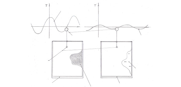 1. Простой рисунок все очень хорошо объясняет. Кладем в одну форму, вот, на рисунке – слева, некую метку, допустим, треугольник. Некоторое время ждем. Затем капаем на поверхность воды во второй форме немного чернил. Они расплываются – и повторяют очертания метки в форме «А». Можно получить несколько подобных фигур. Не обязательно применять чернила. Все то, что пластично, меняется с течением времени, так же может обнаружить взаимосвязь подобных форм.