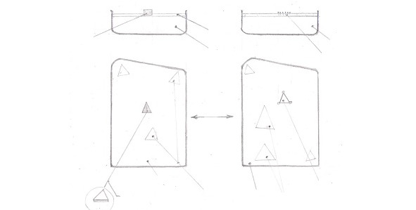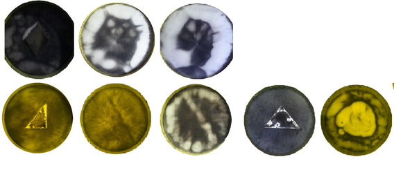 3. Две одинаковые установки «А» и «В» располагаются рядом, на горизонтальной поверхности. В «А» кладется метка, «В» остается пустой. Какой-либо видимой физической связи между «А» и «В» нет. Диффундирующие чернила показывают «отражение метки» и в этом случае. Верхний ряд – в двух экспериментах – «отражение метки-ромба». Нижний ряд – «отражение метки – прямоугольного треугольника». Второй эксперимент с ромбом проводится после использования установок в опыте с треугольником. Возможно, именно поэтому «призрак ромба» составляется теперь как бы из мозаики прямоугольных треугольников.