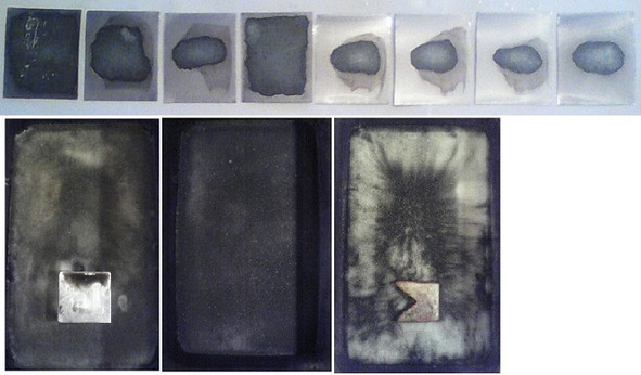 2. Одни из первых результатов лаборатории. Вверху – серия фотографий растворяемых в соляной кислоте, одинаковых оцинкованных пластинок. Время реакции во всех случаях одно и то же. Каждый раз для очередного эксперимента приготовляется свежий раствор. Первый опыт – максимум растворения, почти вся поверхность «съедена» агрессивной средой. Второй и третий эксперимент – интенсивность воздействия снижается. Четвертая проба – интенсивность выходит практически на прежний уровень. После характерного скачка, сила реакции уменьшается, и остается стабильно на низком уровне.