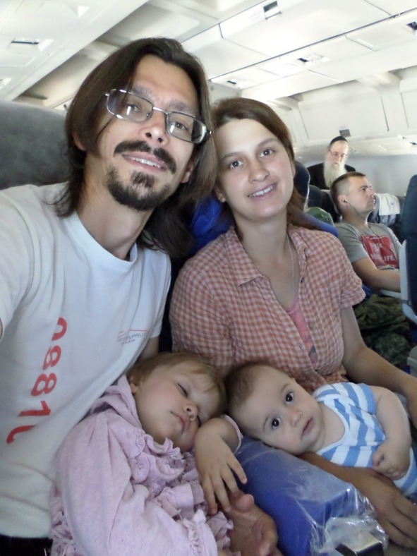 Последняя проверка пройдена и мы идем по длинному коридору на посадку. А мне все еще не верится. Перед самой посадкой самолет нам поменяли. Причину не объяснили, возможно неполадку нашли. По этому детской люльки, которую мы заказали заранее, нам не предоставили. В этом самолете ее некуда было крепить. Пришлось все время полета, десять часов без пересадок, держать Семена на руках. Это, конечно, было тяжело, подремать было невозможно. И мы и дети очень устали. За десять часов нас покормили два раза, порции были просто смешные. Я чуть не умерла с голоду. При том, что меня ведь весь полет ели оба моих присосыша. Но это были такие мелочи! Господи, наша мечта сбылась! Лесана покапризничала только один раз, когда на посадке ее пристегнули ремнями безопасности на отдельном сидении. Семен почти весь полет спал. И, в целом, я считаю, что долетели мы хорошо.