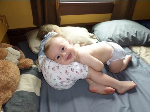 Семена мы уже помаленьку прикармливаем, ему уже шесть месяцев, правда, он с большим желанием облизывает мамины тапочки, чем ест кашу или пюре. Начал ползать по-пластунски, да так быстро! С большим азартом охотится за тапочками. Еще шоколадные шарики ему пришлись по душе. Это он сам решил ими прикормиться по моему недогляду. Я была в шоке! История начиналась с классического «вышла мама на несколько минут из комнаты» (ходила вещи постиранные забирать в подвал из общей стиралки). Прихожу, а там такая картина: дети мои лежат на полу, смотрят мультики с моего телефона и жрут шоколадные шарики хрустящие (типа сухого завтрака, с шоколадным кремом внутри). Это Лесана сама и мультики включила, и вкусняшки достала и с братом поделилась. А Семен и рад, лежит довольный такой, рожица в шоколаде. В общем, весело живем. Не скучаем. Дети нам скрашивают волнительные последние дни ожидания.