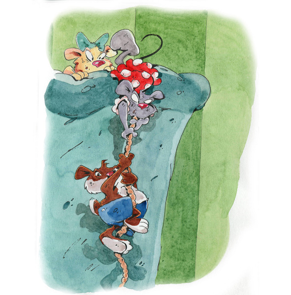 Пипито толкнул рюкзачок в сторону Паулины, она на миг замешкалась. Хомяк бросился бежать. И тут на него сверху упала веревка. Зизи и Лили крепко держали её в лапках.