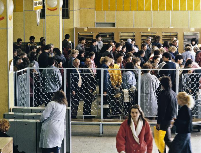 Продовольственный кризис в Москве. Очередь в продовольственном магазине. 1990