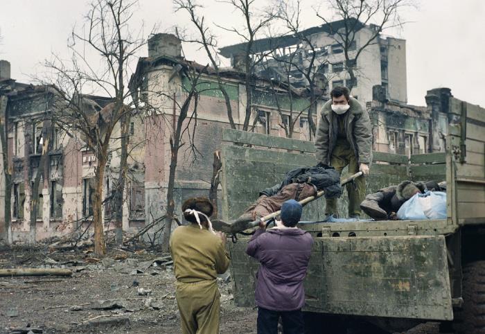 Работа специальной бригады ГКЧС РФ подбирает трупы убитых на улицах города. События Первой Чеченской войны. 1995