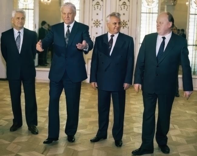 Президент РФ Борис Ельцин (второй слева), Президент Украины Леонид Кравчук (второй справа) и Председатель Верховного Совета Белоруссии Станислав Шушкевич (справа) во время встречи в Беловежской пуще для подписания Соглашения о создании СНГ. 1991