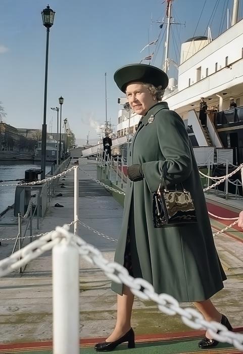 Королева Великобритании и Северной Ирландии, ее Величество Елизавета II сходит с яхты «Британия» и направляется в Государственный Эрмитаж во время визита в Россию. Октябрь 1994