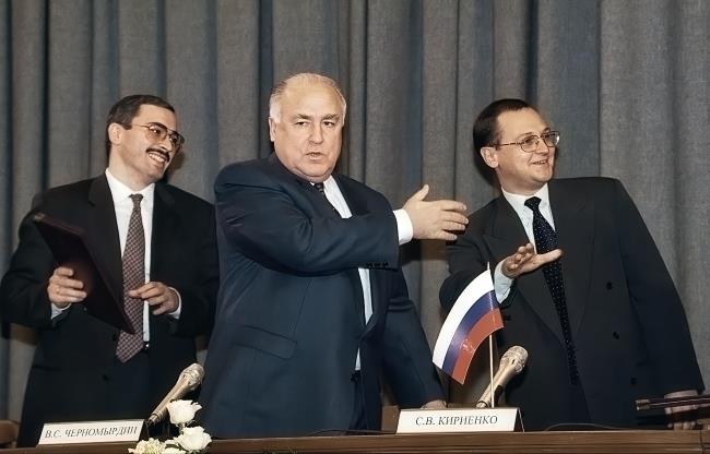 Президент компании ЮКОС Михаил Ходорковский (слева), премьер-министр РФ Виктор Черномырдин (в центре) и министр топлива и энергетики РФ Сергей Кириенко (справа) на церемонии подписания Меморандума о намерениях объединения нефтяных компаний ЮКОС и «Сибнефть». 1998