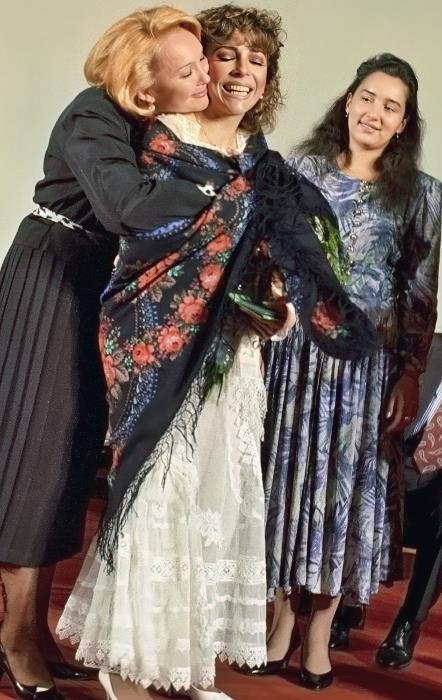 Заслуженная артистка РСФСР Наталья Гвоздикова (слева) дарит павлопосадский платок Веронике Кастро во время встречи в Доме кино. 1992