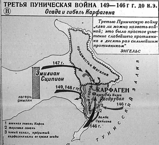 И римские вожди, и римское войско являлись и здесь в том же невыгодном, жалком виде, как в Испании. Тогда начальство поручено было Сципиону Эмилиану, единственному из римских офицеров, который проявил под Карфагеном и находчивость, и решительность, и благоразумие, и блестящую храбрость, так что приобрел уважение и всего римского войска, крайне распущенного, и даже врагов. Сципион прежде всего очистил армию от массы вредного сброда, накопившегося там, железною рукою восстановил дисциплину и энергично повел осаду. Скоро внешнюю стену карфагеняне потеряли, но тем упорнее защищались они за вторым рядом укреплений. Сципион установил тесную блокаду города с суши и с моря и, соорудив с величайшими усилиями плотину, преградил доступ в гавань, через которую осажденные получали все необходимое. Карфагеняне, со своей стороны, прокопали широкий канал, и флот их совершенно неожиданно вышел в море. Если бы карфагеняне немедленно напали на римские суда, совершенно не готовившиеся к бою, они причинили бы римлянам чрезвычайный ущерб, но они удовольствовались на этот раз тем, что убедились в возможности выводить корабли по каналу, и напали на римский флот только через три дня, когда уже Сципион приготовился к битве. Она осталась нерешительною, при возвращении по узкому каналу карфагеняне потеряли от аварий несколько судов, а в скором времени Сципион преградил им и этот выход. Затем на перешейке, соединявшем город с материком, он возвел огромную прочную стену и с наступлением зимы разместил свои войска в удобном лагере, предоставив голоду и болезням ослаблять осажденный гарнизон.