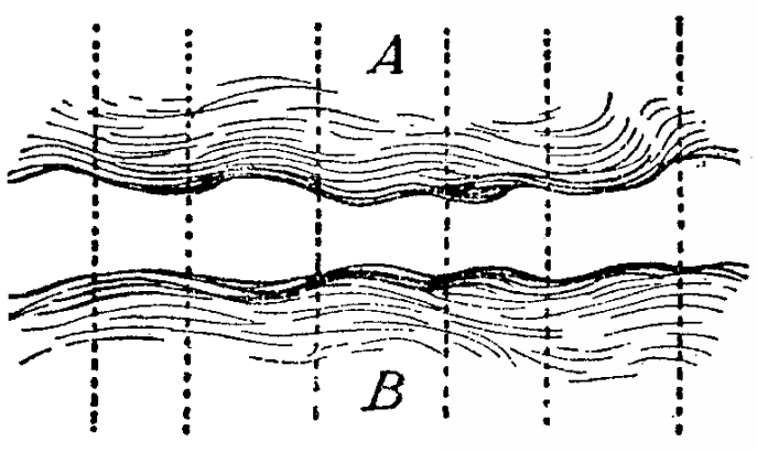 Рис. 1.1 Соссюровское изображение языка в виде интерфейса между планом мысли (А) и планом акустических образов (B). Роль языка состоит в том, чтобы нарезать этот интерфейс на подразделения, обозначенные вертикальными пунктирными линиями, тем самым устанавливая ряд связей между конкретными идеями и конкретными акустическими образами. Воспроизведено по Соссюру (1933: 112).