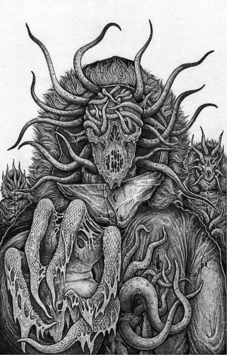 На верху торса этой твари была дряблая грубая шея, напоминающая смятый шарф или крайнюю плоть. А выше – нечто похожее на большую пятиконечную морскую звезду грязно-желтого цвета. Радиальные отростки звезды были похожи на заостренные обвисшие трубки, и в конце каждой из них виднелся выпуклый красный глаз.