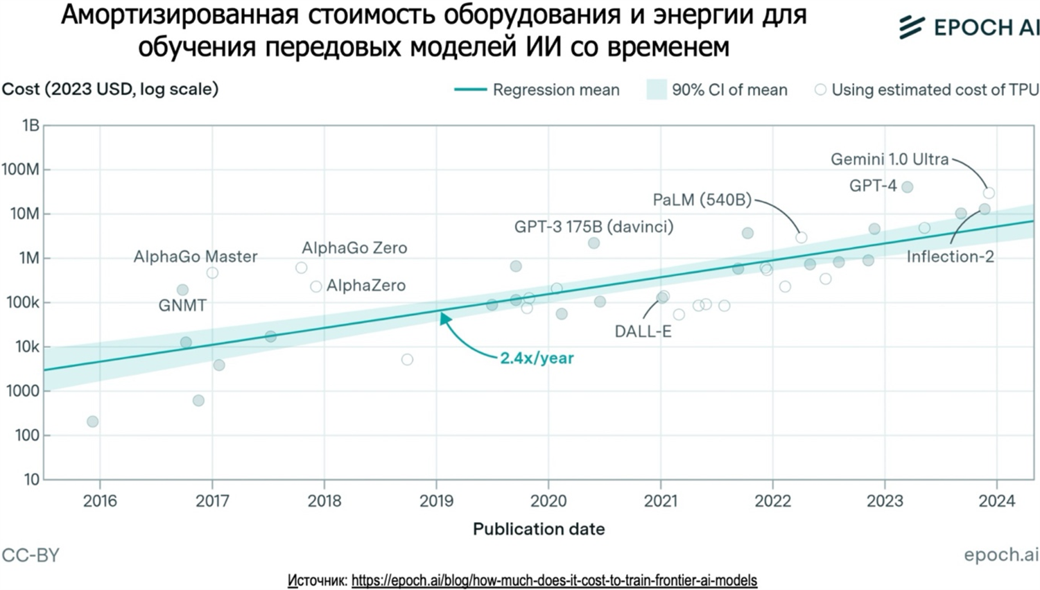 • общий бюджет на обучение может превышать десятки-сотни миллионов долларов (учитывая железо, энергию, инженеров, инфраструктуру).
