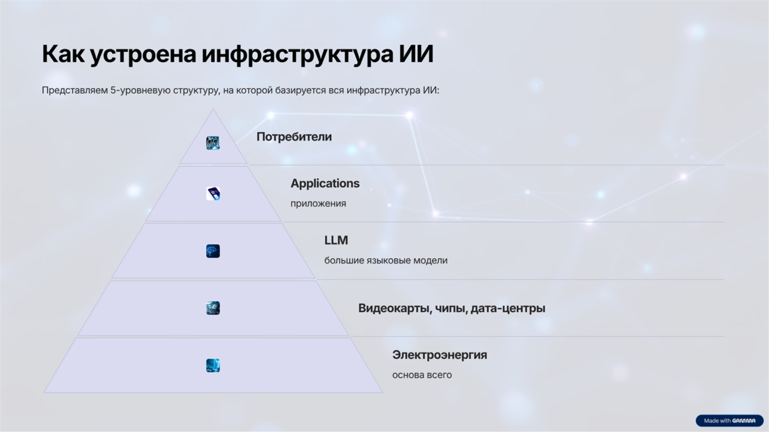 • Про то, как устроен мир ИИ как инфраструктура – от энергии и чипов до дата-центров, платформ и моделей доступа.