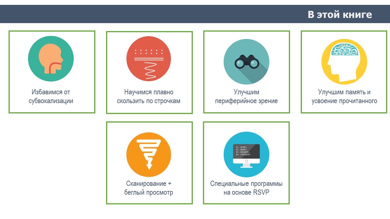Мы научимся читать без субвокализации. Это проговаривание текста про себя, которое затормаживает нашу скорость чтения. Большинство из нас использует субвокализацию с детства и мы так от нее и не отвыкли. Мы научимся нескольким простым приемам, как от нее избавиться.