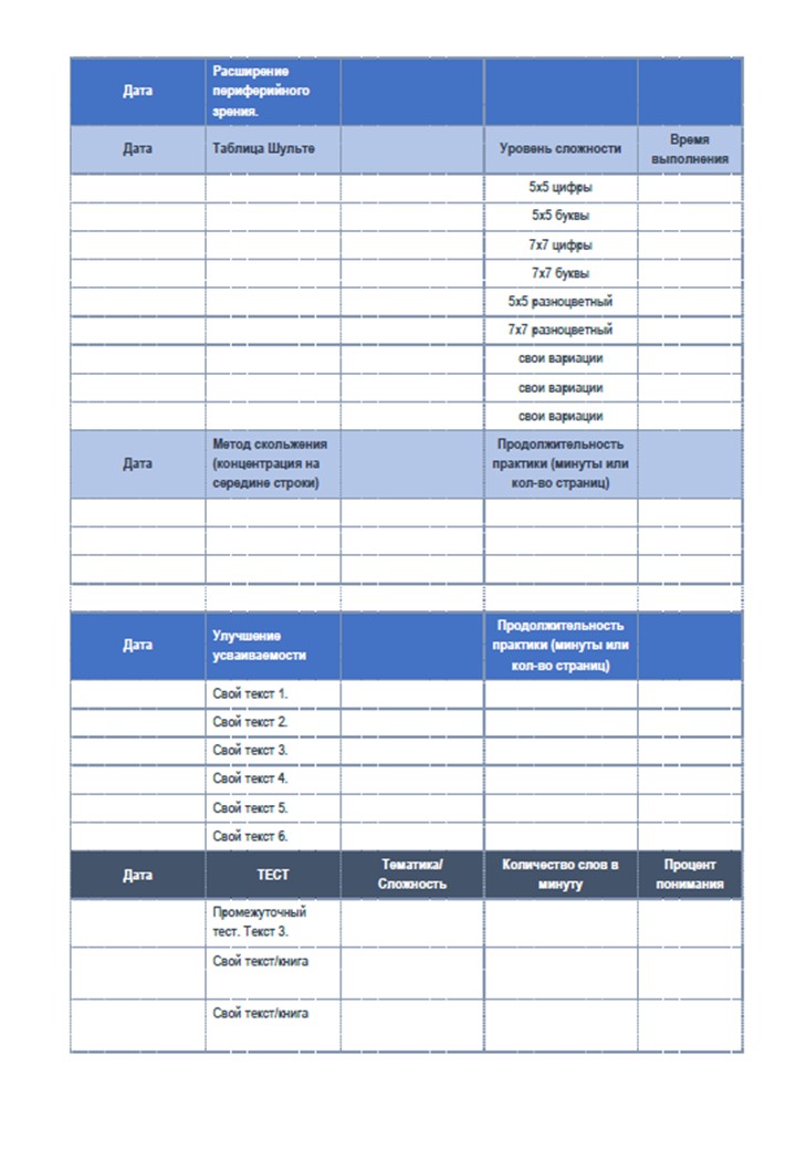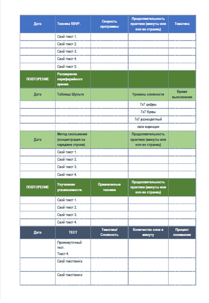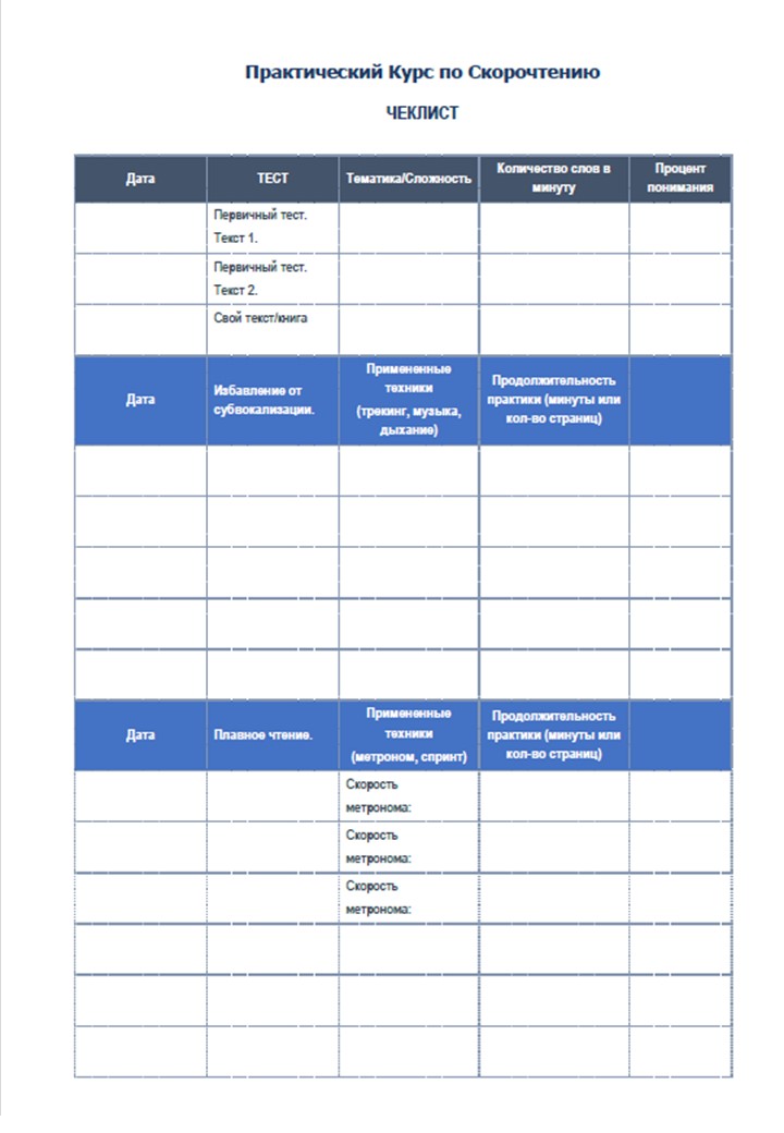 Для того, чтобы вы могли отслеживать свой прогресс заведите себе специальный Чек-лист, который вы можете заполнять во время прохождения данного курса. В него вы можете заносить результаты вашего начального, промежуточного и финального тестов на проверку скорости чтения, а также результаты тренировок по освоению тех или иных приемов.