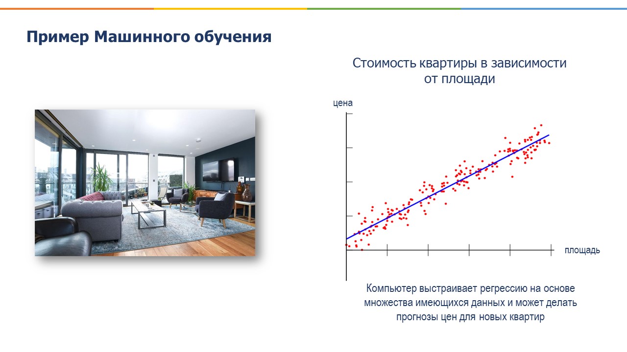 Другой пример, предположим, нам надо понять, как будет вести себя цена квартиры при изменении тех или иных параметров, например, в зависимости от площади, удаленности от метро, этажности и прочих факторов. Мы загружаем данные с разными квартирами, и компьютер создает модель, по которой можно будет предсказать цены в зависимости от этих факторов. Мы можем регулярно обновлять эти данные, и наш алгоритм будет обучаться на основе этих новых данных и каждый раз будет усовершенствовать свою точность по предсказанию цены в зависимости от параметров.