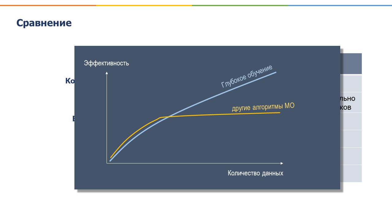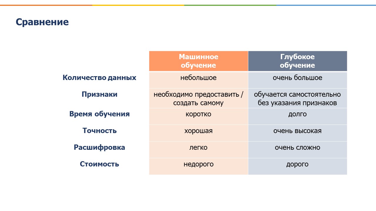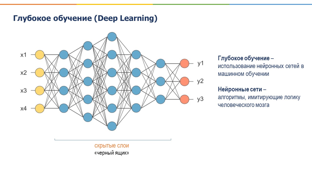 Случаи, когда мы вместо того, чтобы давать компьютеру написанные инструкции и правила для решения вопроса, даем ему набор данных и он сам учится на них и находит необходимые алгоритмы и закономерности самостоятельно, такие случаи называются Машинным обучением. И одним из вариантов нахождения компьютером таких закономерностей является глубокое обучение, в котором используется несколько слоев нейронных сетей, что делает такие вычисления с одной стороны, более эффективными, с другой стороны, более трудными для расшифровки.