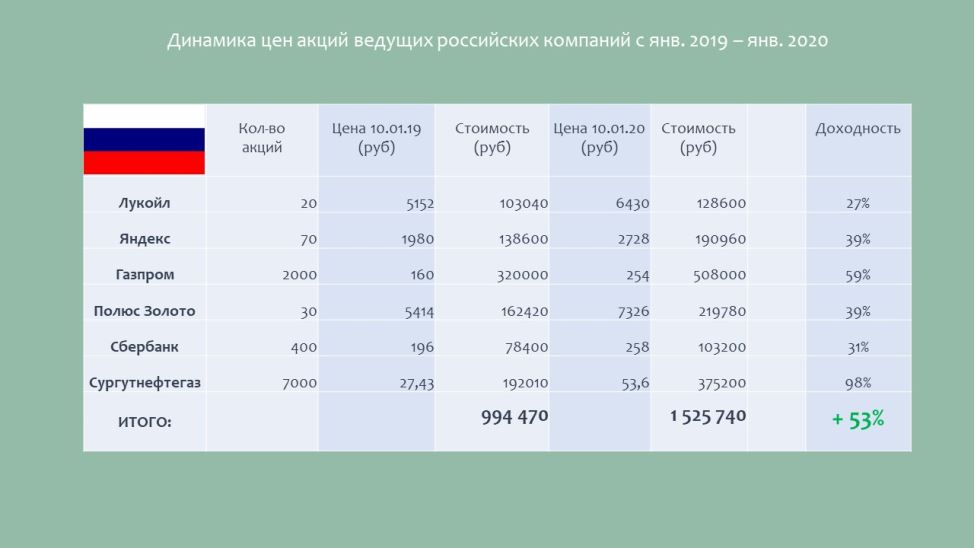 Российский рынок акций, даже несмотря на санкции, также показывал хорошие результаты, особенно в нефтегазовом секторе. Вложив 1 млн рублей в ведущие российские акции в январе 2019 года, всего лишь через год в начале 2020 года, ваш портфель акций стоил бы уже более полутора миллионов рублей.