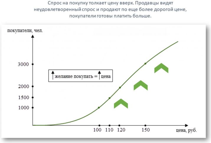 Сейчас одна акция компании A стоит 100 рублей. Вдруг возникает много желающих купить эту акцию по 100 рублей (увеличивается спрос). Однако продавцов, которые готовы продать за эту цену, на всех не хватило, и остались неудовлетворённые покупатели, которые ещё хотят купить эту акцию, но уже не могут. Тогда эти покупатели предлагают за эту акцию уже 110 рублей, находятся ещё продавцы, которые готовы продать акции за эту немного более высокую цену, но опять всем желающим не хватило. Тогда всё повторяется по кругу, тем, кому не хватило акций по 110 рублей, уже предлагают за неё 120 рублей и так далее. Вот так цена нашей акции уже выросла до 120 рублей.