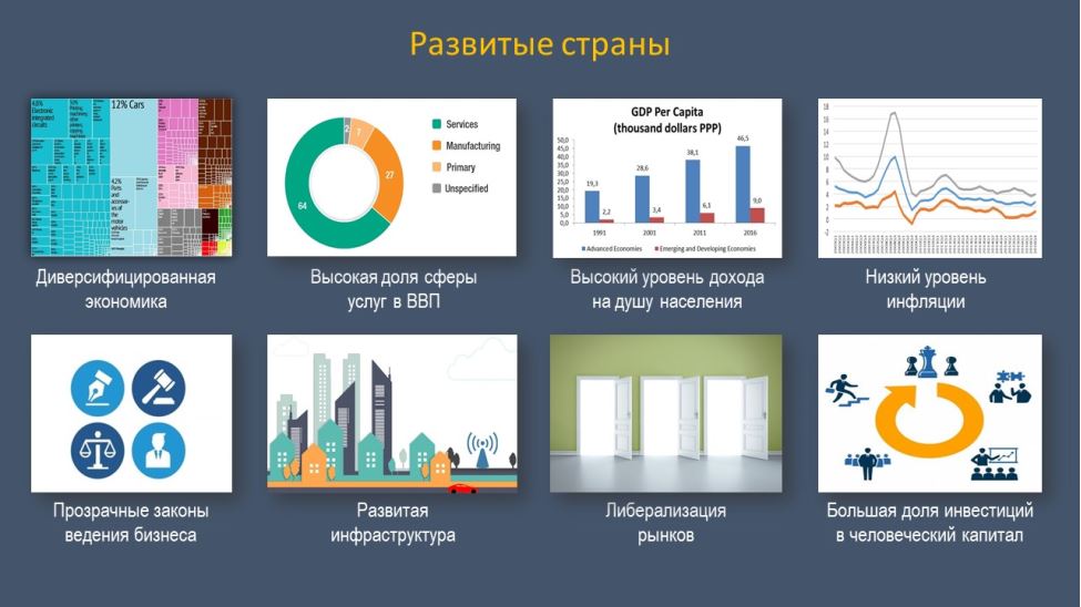 Развитые рынки характеризуются более стабильной и диверсифицированной экономикой, высокой долей сферы услуг в экономике, высоким уровнем дохода на душу населения, относительно низкой инфляцией, прозрачными законами ведения бизнеса, развитой инфраструктурой, либерализацией рынков, низкой долей государственного участия, большой долей инвестиций в человеческий капитал.