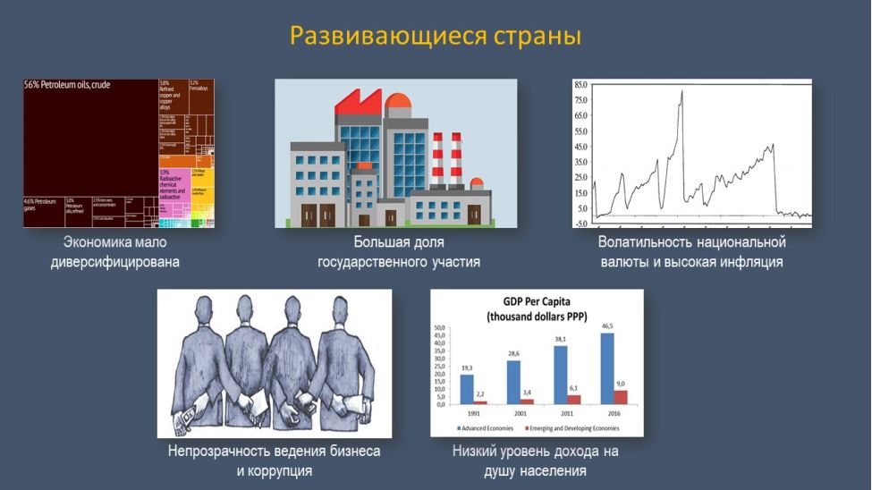 В развивающихся странах, в экономике зачастую большую роль играет государство, то есть крупнейшие компании, как правило, являются государственными, экономика мало диверсифицирована, из-за чего кризис в одной отрасли может повлиять на всю экономику. Денежно-финансовая система зачастую бывает нестабильна, что может выражаться, помимо прочего, в высокой волатильности национальной валюты и инфляции. Кроме того, может иметь место коррупция и непрозрачность ведения бизнеса, что увеличивает риски для иностранных инвесторов.